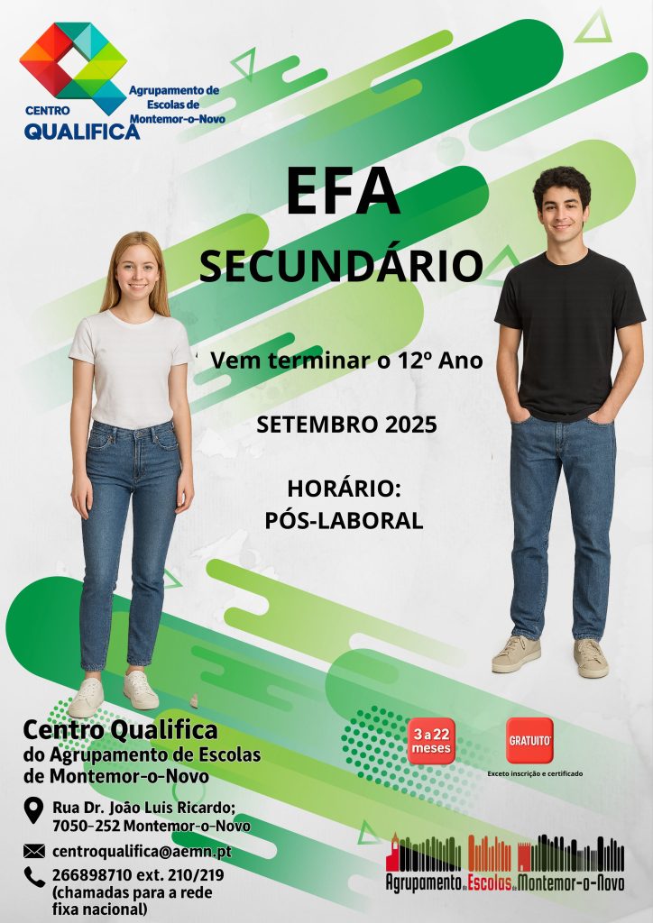 Centro Qualifica _ EFA Secundário Julho 23, 2025 por admin EFA Secundário: Queres terminar o 12.º ano?Oportunidade única para jovens e adultos!O Centro Qualifica do Agrupamento de Escolas de Montemor-o-Novo tem inscrições abertas para o curso EFA Secundário, com início em setembro de 2025. Curso gratuito (exceto inscrição e certificado) Duração: de 3 a 22 meses, consoante o percurso formativo: A,B ou C Horário Pós-Laboral – ideal para quem trabalha! Local: Rua Dr. João Luís Ricardo, Montemor-o-Novo centroqualifica@aemn.pt 266898710 (ext. 210 ou 219) Aumente as suas oportunidades profissionais. Invista em si! #EFA #CentroQualifica #12Ano #EducaçãoDeAdultos #MontemorONovo #Formação #Qualifica #AEMN