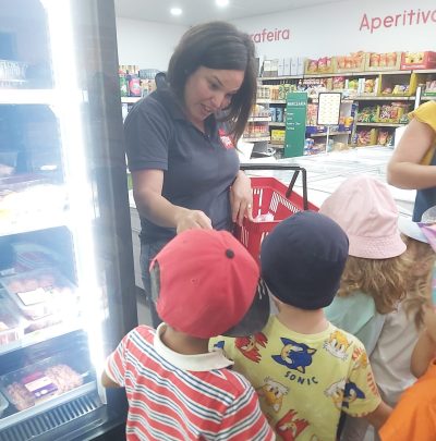 A sala de Jardim de Infância foi às compras ao supermercado. A D. Sara ofereceu um saco com alimentação saudável a cada criança. Muito obrigada pela oferta! Depois, na sala, fizemos uma atividade com recorte e colagem sobre os alimentos saudáveis e não saudáveis.