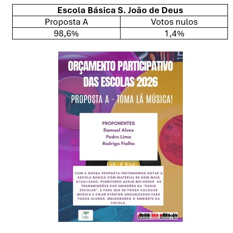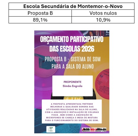 Orçamento Participativo das Escolas 2026 – Resultados da Votação Abril 24, 2026 por admin Na sequência da votação das proposta apresentadas, que decorreu no dia 24 de abril, partilhamos os resultados obtidos para cada uma das escolas.Para a Escola Básica S. João de Deus, os resultados foram os seguintes: Relativamente à Escola Secundária de Montemor-o-Novo, obtiveram-se resultados: